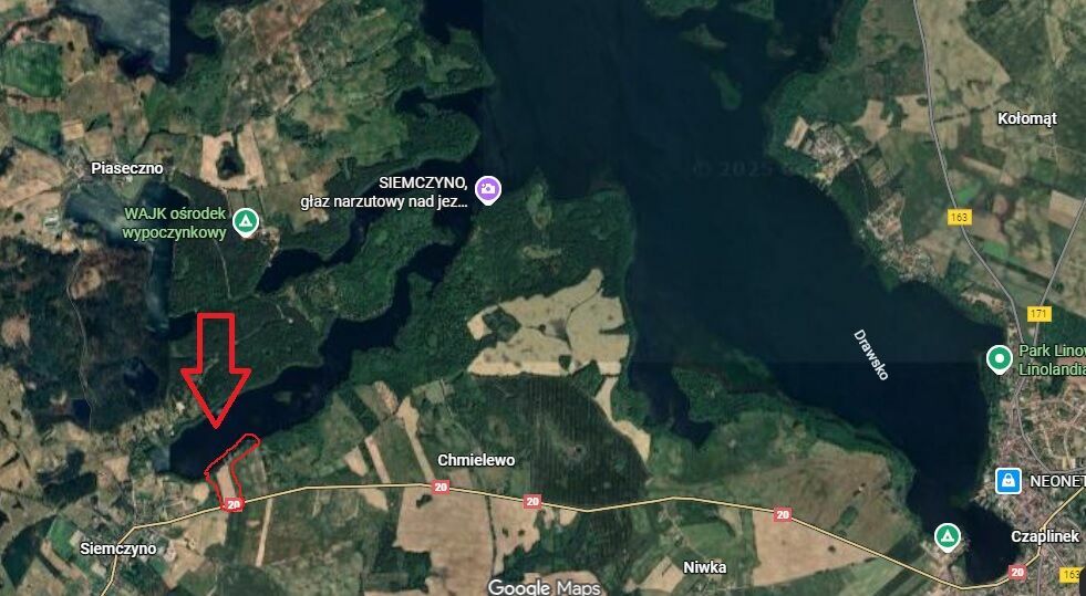 Dostęp do drogi krajowej DK20, pozwolenie na zjazd. W pobliżu slip do wodowania łodzi, Pałac Siemczyno, Czaplinek i wiele atrakcji. Gwarantowany wypoczynek w czystym i cichym zakątku Pojezierza Drawskiego. Okazyjna cena.